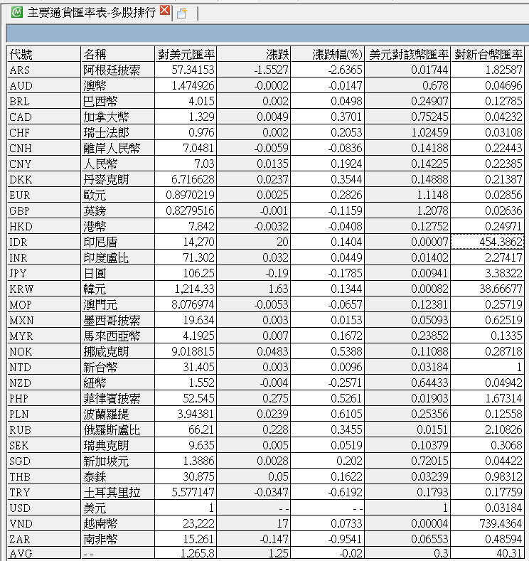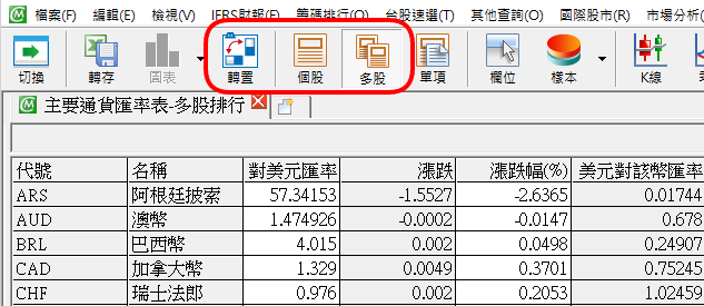 顯示資料後,點【多股】 - 點【轉置】讓貨幣名稱由上往下排列