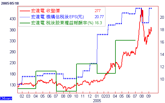 範例2:例如您可設定宏達電股價、ROE及機構EPS預估值月調整數字 三者間之關聯圖