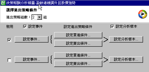 設定不同的事件發生時,進行不同的策略買賣。例如,您可測試:當大盤月線走跌時,用低本益比策略、當大盤月線走揚時,用營收盈餘成長策略。